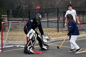 In partnership with local businesses and sports teams, the department has obtained an assortment of sports equipment and set up a basketball court and hockey "rink" across the street from the police station. We use this equipment to challenge local youths, and community organizations to games against members of our department. We also have a mobile basketball net we bring to area schools and events.